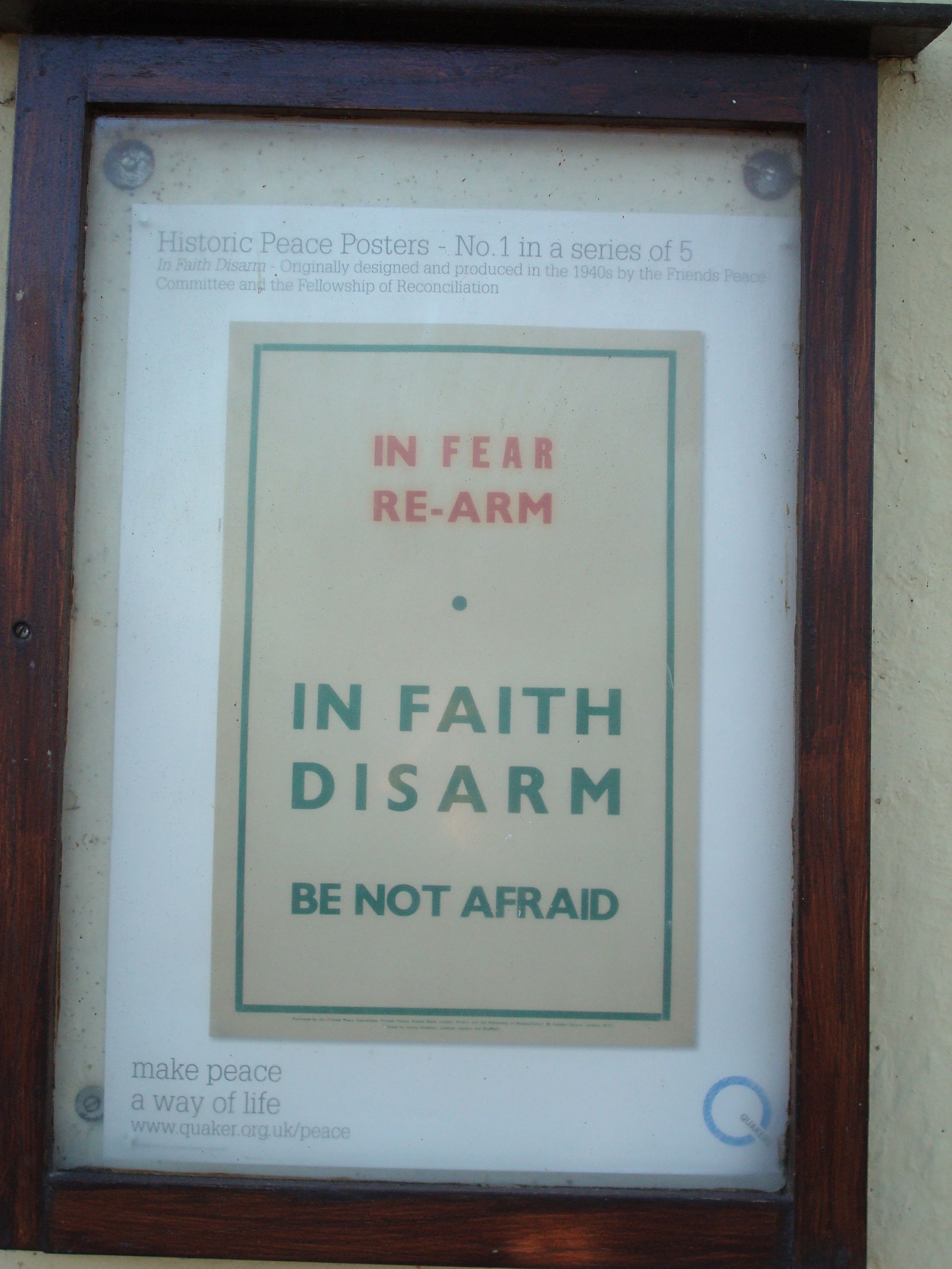But the irony is greater still, for mere steps south of the Army recruiting office and the war memorial, one comes to the local meeting house for the Society of Friends. As they did during the two world wars, English Quakers today oppose warfare. So, in the shadow of the war memorial and within shouting distance of the British Army office, there hangs this reproduction of an iconic Quaker poster: