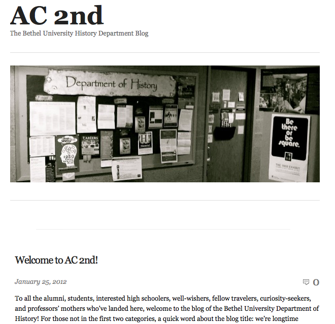 Yes, it’s AC 2nd: The Bethel University History Department Blog! Which, you may have noticed, is now on my Recommended Links list and has joined the collection of news feeds on this blog’s home page.