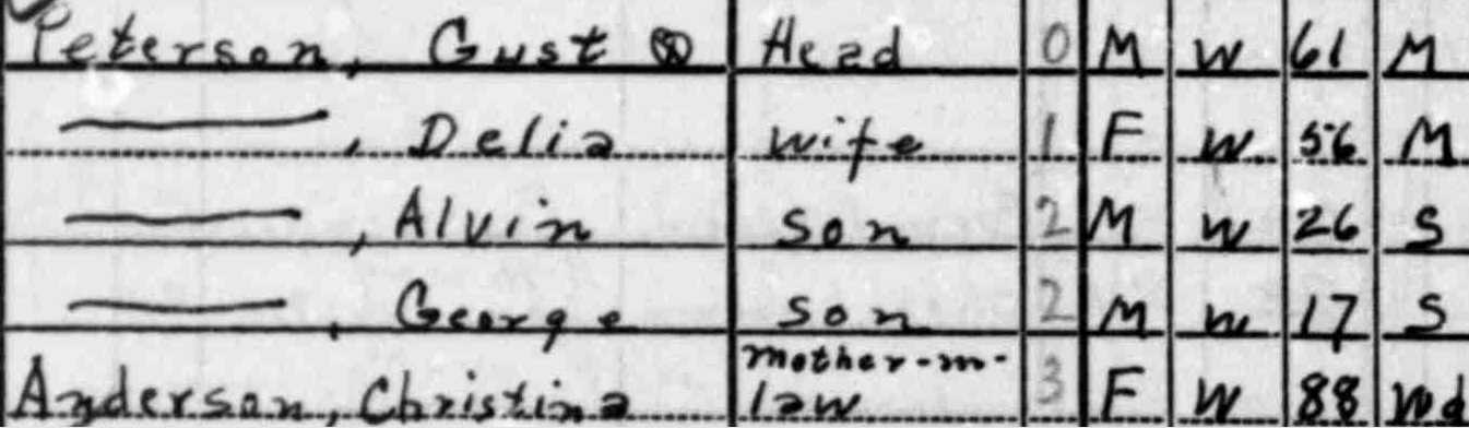 At the same time, the census records hint that Gust — who not only could afford to take in an elderly relative but could proudly tell the census-taker that he owned his own home — provided his youngest son with a relatively comfortable upbringing. At least compared to the circumstances of the woman that young George Peterson would marry six years after this census was taken.