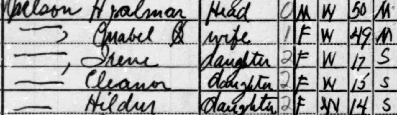 But in 1940 Hjalmar is listed as being “Unable to work,” and he reported no wages or salary. (Nor did the other members of the family.) A heavy smoker, he had begun to experience heart problems and emphysema in the 1930s, ailments that would bring about his death ten years later, at the age of 60. The census schedule notes that my great-grandmother actually answered the enumerator’s questions. It fits with her personality (in the family history, her daughter makes clear that Mabel was the organized member of the partnership), but it is all too easy to imagine Hjalmar simply not wanting to tell a stranger about his unemployment, financial status, or other private concerns.