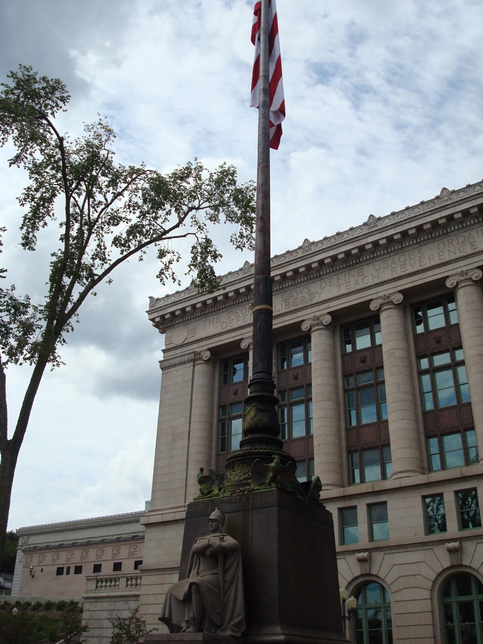 The courthouse and monument are just part of Duluth’s Civic Center district, which architectural historian David Gebhard calls “one of the most impressive Classical civic centers in the country,” and — with the state capitol building in St. Paul — “[presenting] the fullest realization of the turn-of-the-century City Beautiful movement in Minnesota” (Guide to the Architecture of Minnesota, p. 187). It’s also worth noting that City Beautiful drew heavily from the French Beaux-Arts school, which strongly influenced Paul Bartlett, the sculptor of the “Patriotism” figure guarding Duluth’s memorial flag pole.