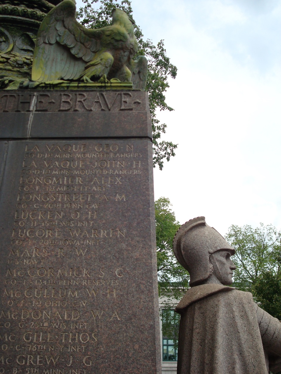 Detail of the Soldiers and Sailors MonumentErected three years after the war’s end, the Duluth monument fits the Schwartz’s description perfectly. Indeed, it even illustrates the connection he draws between the Civil War and World War I. While clearly influenced (and occasioned) by America’s participation in WWI, the soldiers and sailors named are actually veterans of the war of 1861-1865, and the monument was commissioned by the local post of the Grand Army of the Republic — the still-influential fraternal organization uniting Civil War veterans — and not by the new American Legion, whose founding convention had drawn Great War veterans to Minneapolis just two years before. (As far as I know there aren’t actually any WWI dead listed — though I’d welcome clarification to the contrary.)
