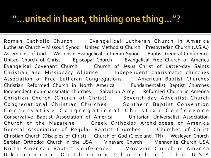 My best illustration is to put up a PowerPoint slide (right) listing all of the denominations (plus a couple of clusters of non-denominational churches) that have at least 1000 adherents in the state of Minnesota alone. All forty-two of them, including half a dozen Baptist groups. (For the whole country, we’d need to add at least 81 more denominations with 1000 members — and this only includes the groups that take part in such data-gathering.) The slide is titled with some of Paul’s words from Philippians 2, quoted earlier by Ignatius Loyola in his explanation for the importance of a magisterium.