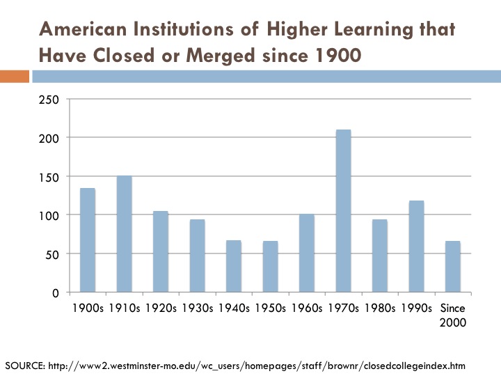 4 thoughts on “How Many Colleges and Universities Have Closed, Decade by Decade, Since 1900?
