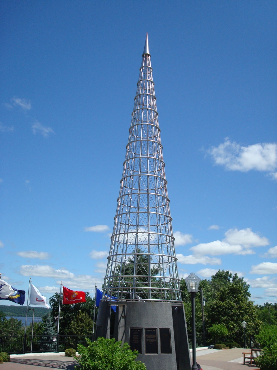 But starting in the late Eighties (e.g., the Goodhue County Memorial in Red Wing, MN and its Pierce County neighbor across the river in Ellsworth, WI) and then through the Nineties and early years of the 21st century, more traditional commemorative structures were retroactively added to older parks or became the centerpieces of completely new memorial spaces. Bronze eagles, decommissioned tanks, and flagpoles celebrating not just the nation or POWs and MIAs, but the various armed services, rise above most of the memorial spaces I encountered.