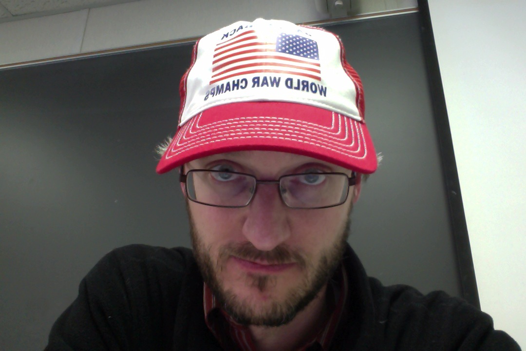 And yet here we are. Taking a hirsute selfie in the middle of giving my World War II students their final exam. While wearing a jingoistic trucker hat (“Back to Back World War Champs”), given me by a few of my World War I students last year.