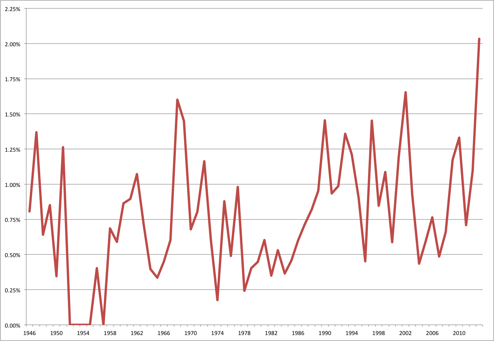 Now let’s express all this in proportional terms: for each year, what percent of all dissertations in the AHA database focused on World War I?