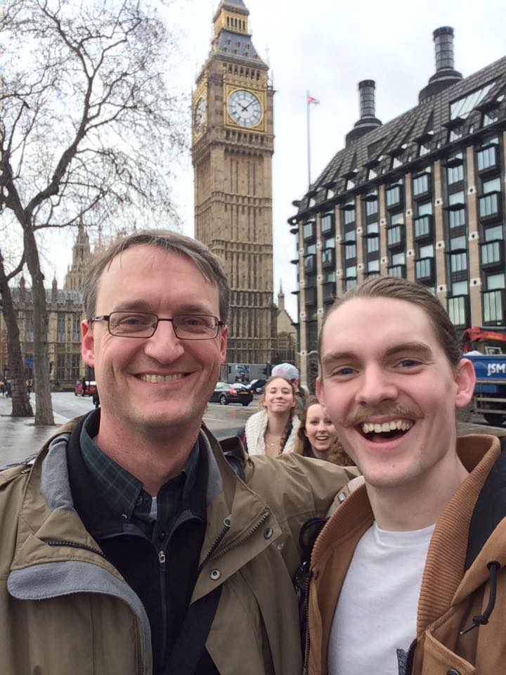 You can find those pictures — and the much superior photos taken by my teaching assistant, Connor Larson (pictured here with me in front of Big Ben) — if you look for the hashtag #BethelWWI.