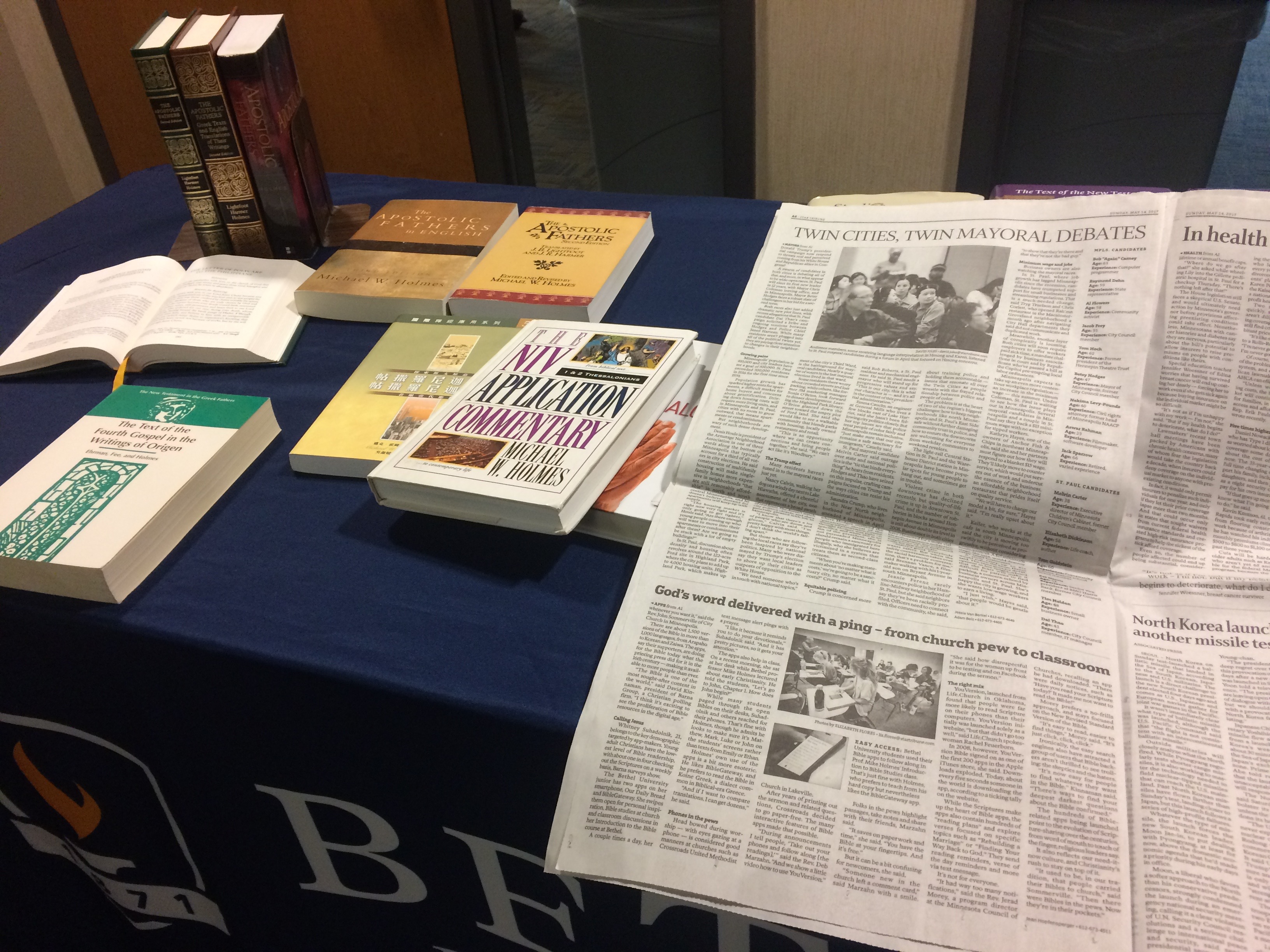 Finally, I headed upstairs to join colleagues and alumni in celebrating the career of Mike Holmes, who has taught in our Biblical and Theological Studies department for thirty-five years. A world-renowned expert in both the Greek New Testament and Apostolic Fathers, Mike is retiring from Bethel in order to focus on his new role as executive director of research at the Museum of the Bible.