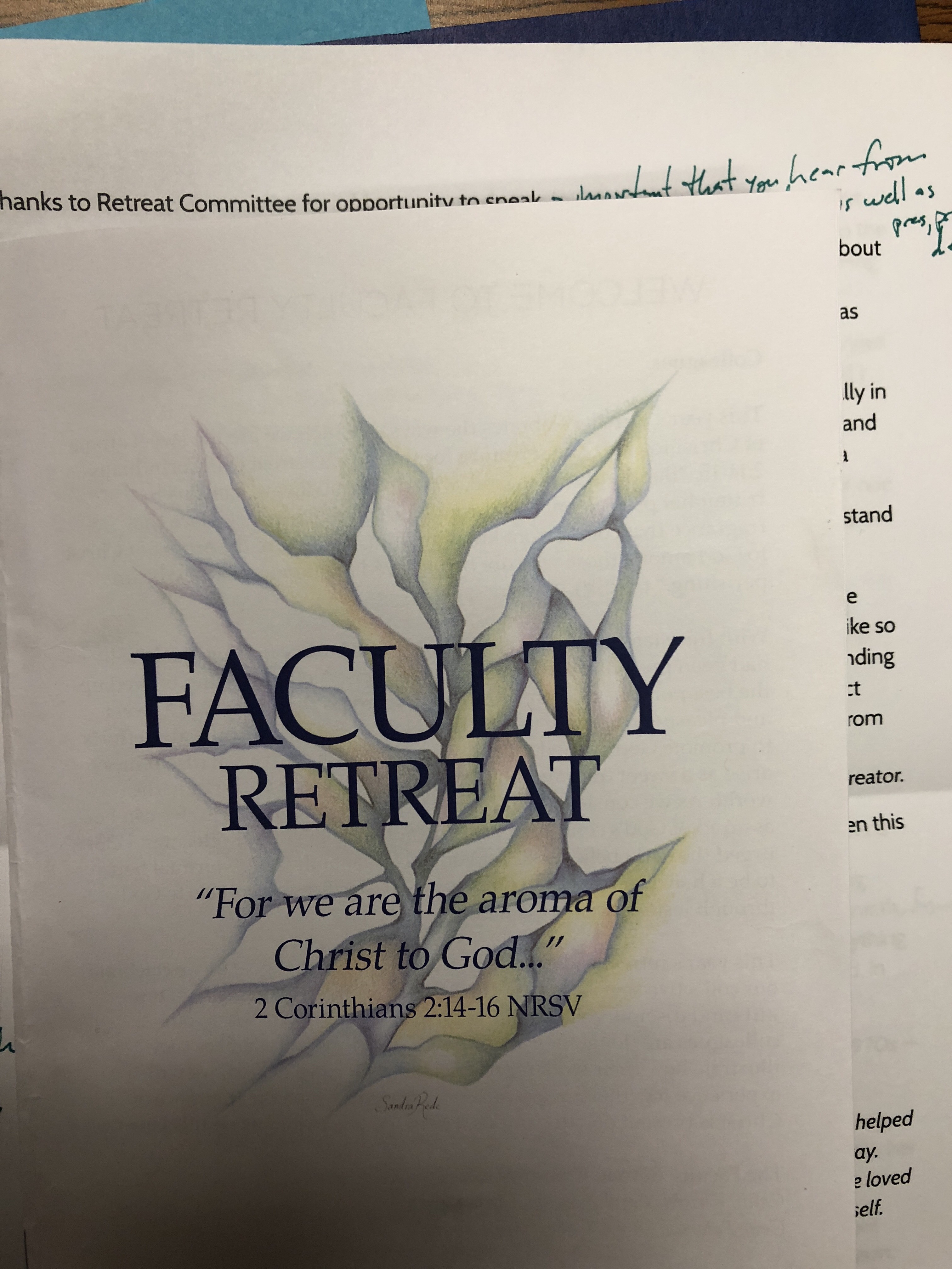 As the apostle Paul says in the verse that follows our theme verse for this retreat, “we are not peddlers of God’s word like so many; but in Christ we speak as persons of sincerity, as persons sent from God and standing in his presence” (2 Cor 2:17). We are not peddlers of God’s word — or even of any subject matter that came into being through the Word of God — but persons of sincerity sent from God as what Paul later calls “ambassadors for Christ” (2 Cor 5:20), not regarding our students from a “human point of view” — as customers or consumers — but as new creations being reconciled to their Creator.