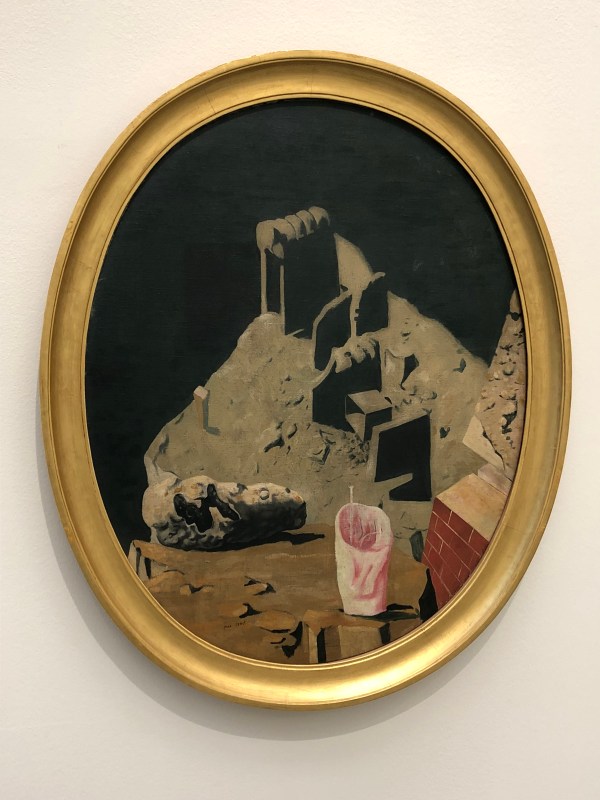 I haven’t been able to find much commentary on this particular work, but knowing that Ernst was drafted into the German Army during WWI tempts certain interpretations. (“On the first of August 1914 M.E. died,” Ernst claimed of his experience of the Great War, “He was resurrected on the eleventh of November 1918.”) It’s hard to look at the painting’s structures and not be reminded of the concrete-and-steel bunkers whose ruins still trace the 440-mile line that the Germans called the “Western Front.”