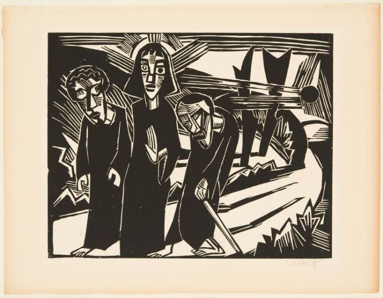 This woodcut of the Emmaus Road comes from a German expressionist artist named Karl Schmidt-Rottluff. Like many of his countrymen, he fought in the First World War. Unlike two million of his comrades, he survived to the end of the conflict in 1918, when he made this work. It shows the two disciples with blinded eyes — perhaps Schmidt-Rottluff was thinking of comrades gassed by chemical weapons — walking alongside Jesus through a world of stark lines, menacing forms, and palpable change.