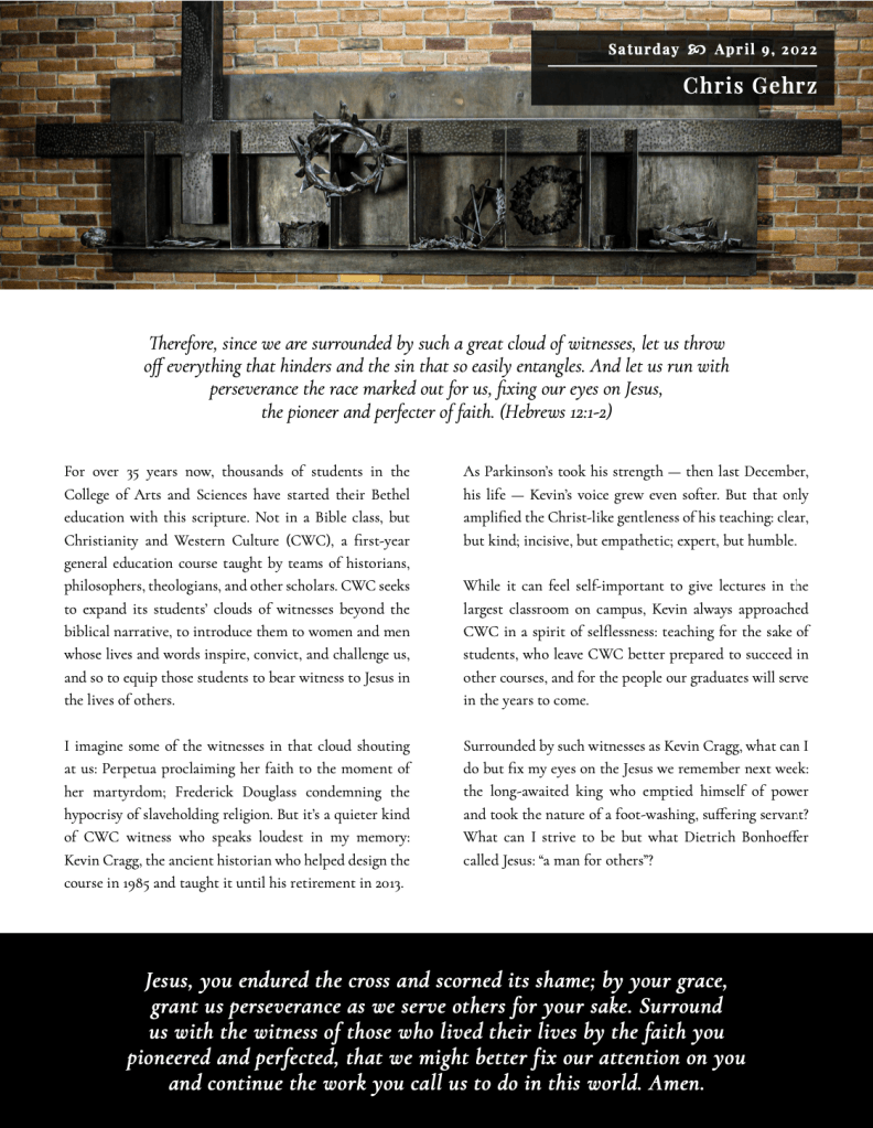 Almost everyone wrote about traditional themes of the season like contemplation, repentance, spiritual disciplines, and salvation. A few also used the project as a prompt to look back at Bethel history, as we near the end of our 150th year. But my personal favorites were the reflections that considered our theme of being “centered on Jesus” in the context of an academic discipline. For example, biologist Joy Doan recalls hearing God’s call while studying in a tropical rain forest, English professors Marion Larson and Dan Ritchie connect Lent to Dante and Augustine, respectively, social worker Nick Zeimet explain what’s “Christ-like and holy” about serving the needs of those on society’s margins, and international relations expert Chris Moore marks Palm Sunday with a reflection on how Jesus “utterly subverted the entire calculus upon which” political power is based.