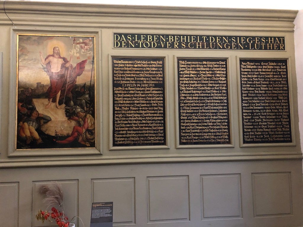 More striking — and more deeply connected to the theme of Wittenberg as “Lutherstadt” — is the small chapel at the rear of the church, where the dead soldiers of Wittenberg are listed, year by year from 1914 to 1918, on two facing walls.