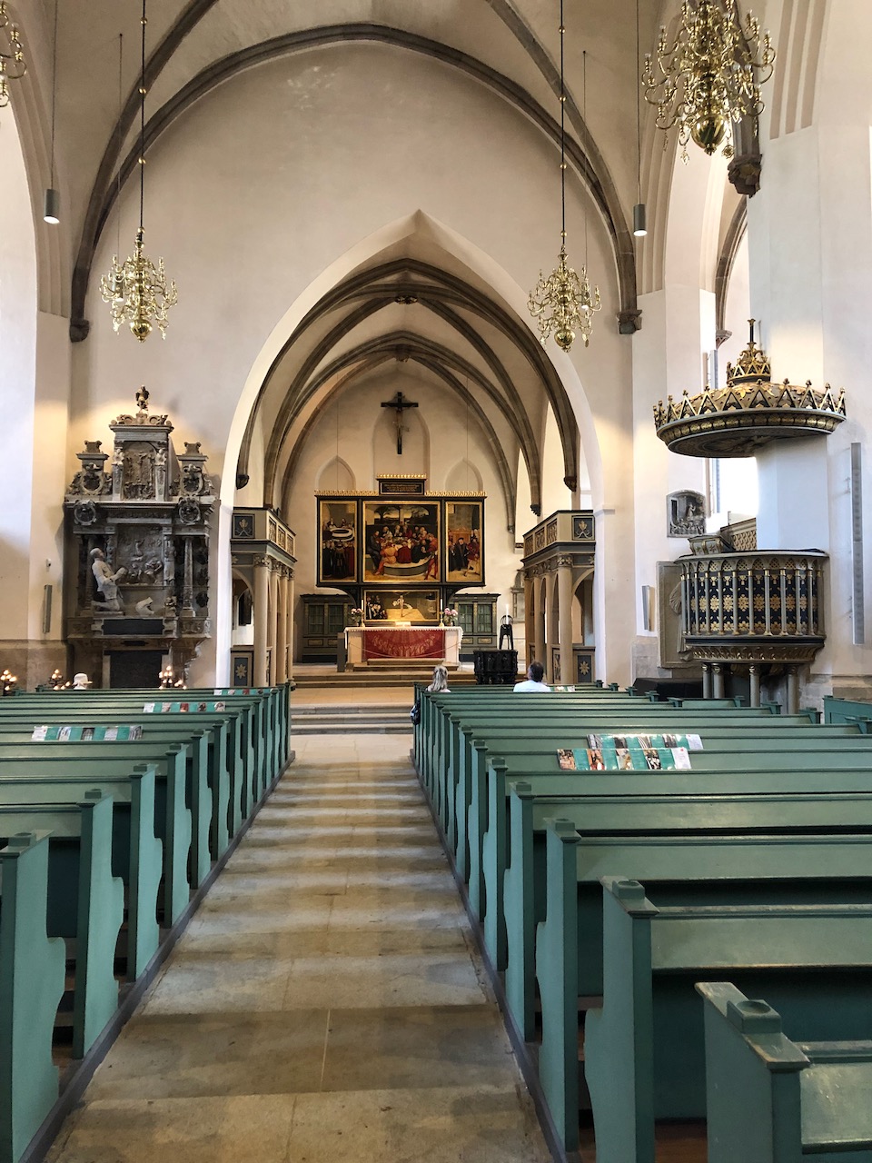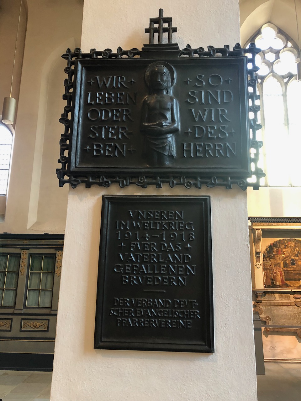 But at St. Mary’s Church, where Luther preached thousands of sermons and the reformer appears as a disciple at the Last Supper in the central panel of Lucas Cranach the Younger’s famous altarpiece, there’s not one, but two WWI memorials. First, a simple memorial on a column to the right of the altarpiece.