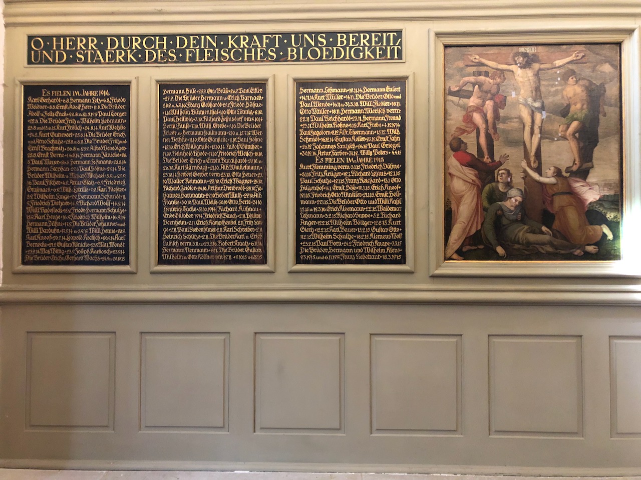More striking — and more deeply connected to the theme of Wittenberg as “Lutherstadt” — is the small chapel at the rear of the church, where the dead soldiers of Wittenberg are listed, year by year from 1914 to 1918, on two facing walls.